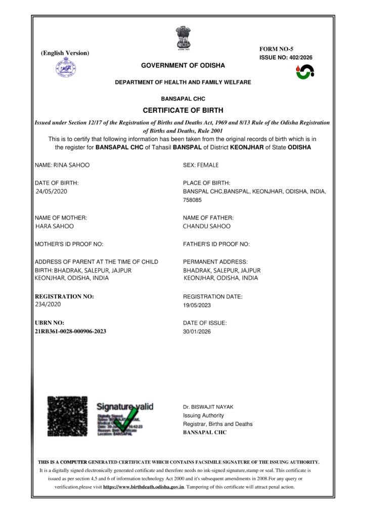 ଓଡ଼ିଶାରେ ଜନ୍ମ ସାର୍ଟିଫିକେଟ୍ (Birth Certificate) ପାଇଁ ଅନଲାଇନ୍ ଆବେଦନ କରିବା ଏବେ ଅତି ସହଜ। ଏଥିପାଇଁ ଆପଣଙ୍କୁ ଆଉ ବାରମ୍ବାର ସରକାରୀ ଅଫିସ ଦୌଡ଼ିବାକୁ ପଡ଼ିବ ନାହିଁ। ନିମ୍ନରେ ଦିଆଯାଇଥିବା ଷ୍ଟେପ୍-ବାଇ-ଷ୍ଟେପ୍ ଗାଇଡ୍‌କୁ ଅନୁସରଣ କରି ଆପଣ ନିଜ ମୋବାଇଲ୍ ବା କମ୍ପ୍ୟୁଟର ସାହାଯ୍ୟରେ ଆବେଦନ କରିପାରିବେ।