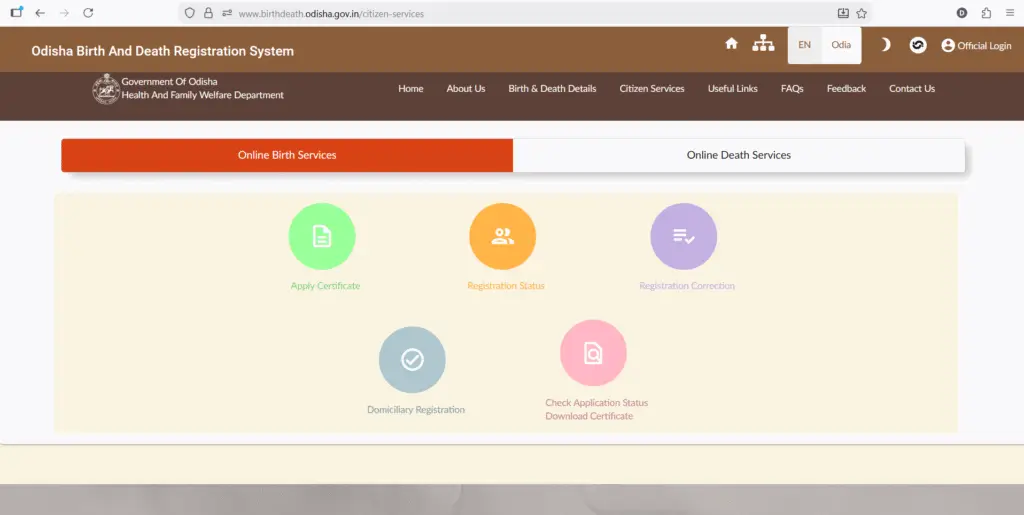 ଜନ୍ମ ସାର୍ଟିଫିକେଟ ଆବେଦନ କରିବା ପାଇଁ ସର୍ବ ପ୍ରଥମେ ଯେକୌଣସି ଏକ ବ୍ରାଉଜର କୁ ଯାଇ birthdeath.odisha.gov.in ଲେଖି ସର୍ଚ କରନ୍ତୁ I ନିମ୍ନରେ ଦିଆଯାଇଥିବା ପେଜ ଟି ଖୋଲିଯିବ I