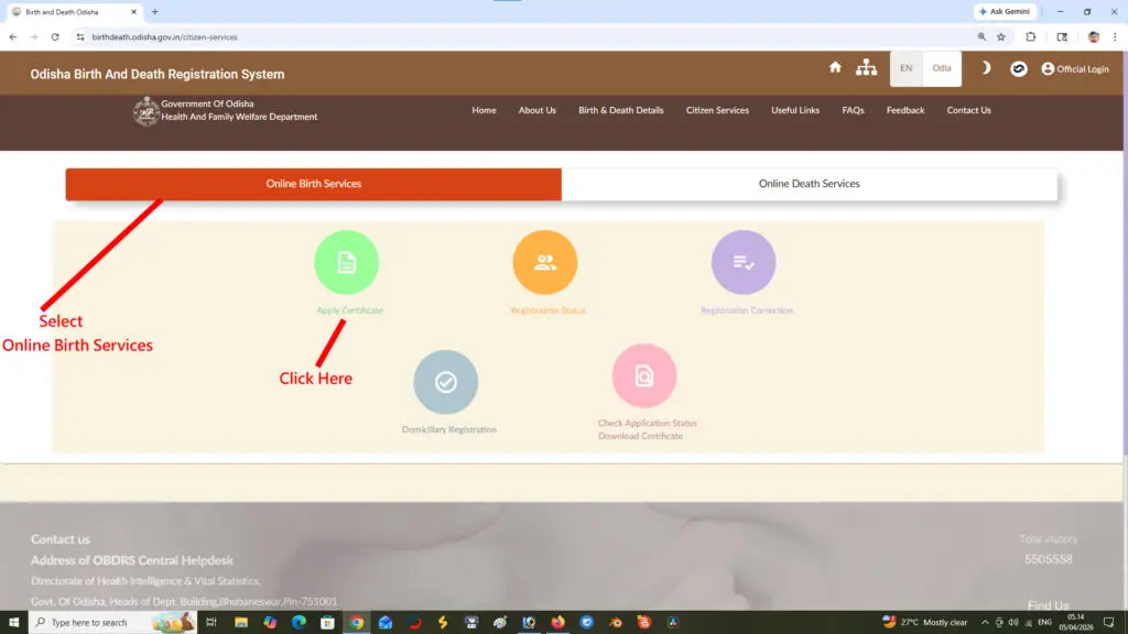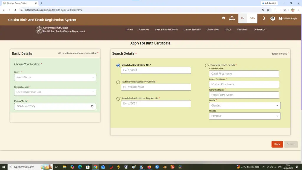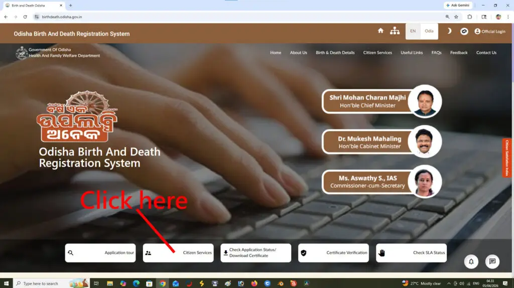 ସର୍ବ ପ୍ରଥମେ ଯେକୌଣସି ଏକ ବ୍ରାଉଜର କୁ ଯାନ୍ତୁ ଏବଂ ସର୍ଚ୍ଚ ବାର ରେ birthdeath.odisha.gov.in ଲେଖି ସର୍ଚ୍ଚ କରନ୍ତୁ ଏହାପରେ ସର୍ବପ୍ରଥମେ ଆସିଥିବା ୱେବସାଇଟ ଉପରେ କ୍ଲିକ କରନ୍ତୁ I (https://www.birthdeath.odisha.gov.in/)