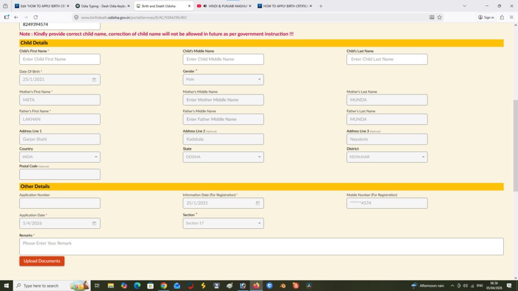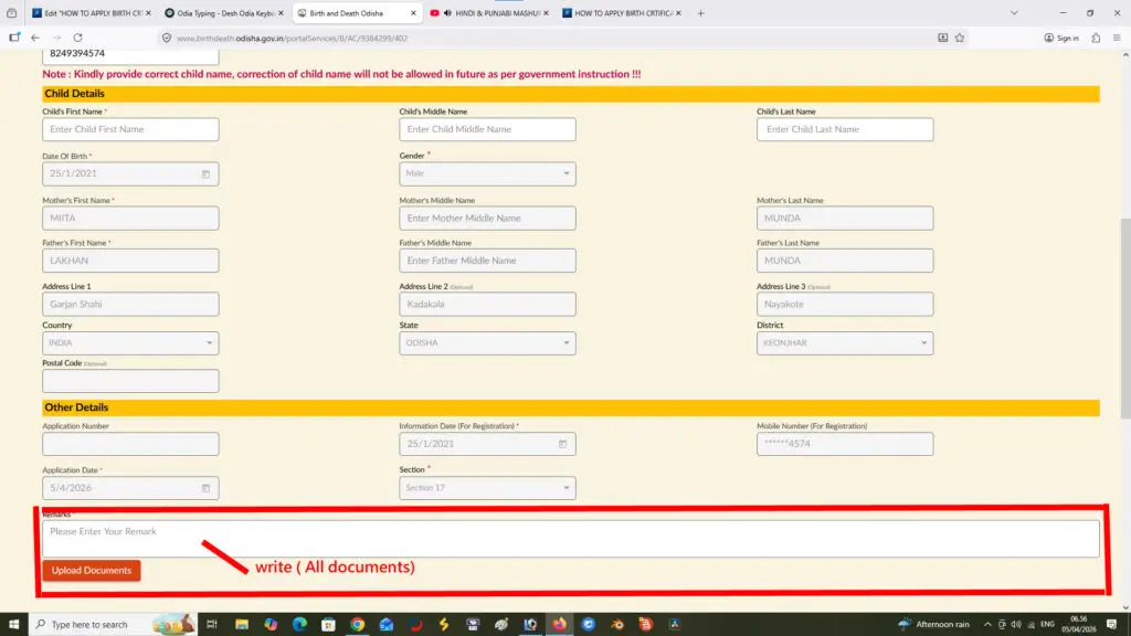 ସମସ୍ତ ତଥ୍ୟରି ସାରିବା ପରେ ଏହି ବାକ୍ସ ରେ All Documents ଲେଖିଦିଅନ୍ତୁ ଏବଂ Upload ଉପରେ କ୍ଲିକ କରନ୍ତୁ I