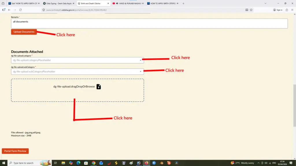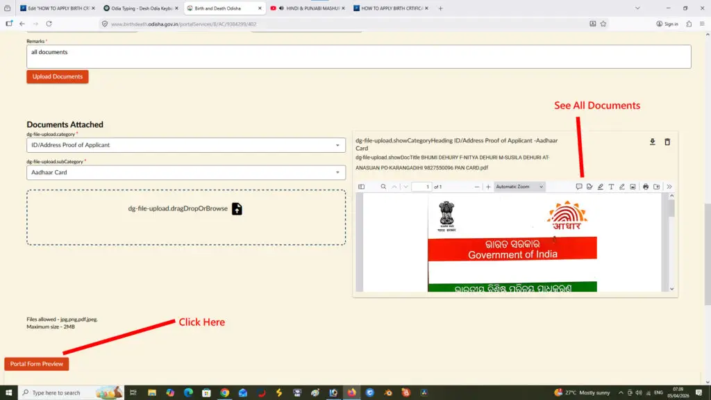 ଆପଣ ଅପଲୋଡ଼ (Upload) କରିଥିବା ଡକ୍ୟୁମେଣ୍ଟ ଗୁଡିକ ଏଠାରେ ଦେଖାଯିବ I ଏହା ପରେ Portal form priview ଉପରେ କ୍ଲିକ କରନ୍ତୁ I ଏହାପରେ ତଳେ ଦିଆ ଯାଇଥିବା ପେଜ ଟି ଖୋଲି ଯିବ