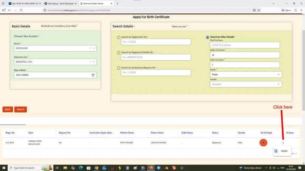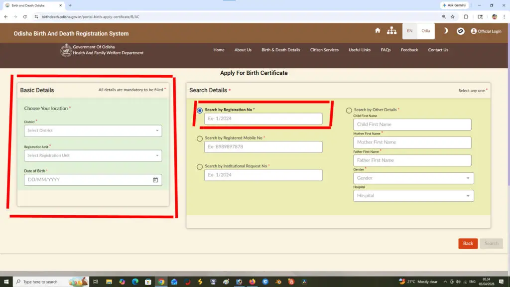 ବାମ ପଟ ଥିବା ବାକ୍ସ ଉପରେ ନଜର ଦିଅନ୍ତୁ ସର୍ବ ପ୍ରଥମେ Basic Details ସେକ୍ସନ ରେ ଧ୍ୟାନ ଦିଅନ୍ତୁ I District ସେକ୍ସନ ରେ ପିଲାଟି ଯେଉଁ ଜିଲ୍ଲା ରେ ଜନ୍ମ ହୋଇଛି ସେ ଜିଲ୍ଲାଟିକୁ ସିଲେକ୍ଟ କରନ୍ତୁ ,ଏହାପରେ Registration Unit ସେକ୍ସନ ରେ ଯେଉଁ ଜିଲ୍ଲା ରେ ଜନ୍ମ ହୋଇଛି ସେ ଜିଲ୍ଲା ଅଧୀନରେ ଥିବା ମେଡିକାଲ ଅର୍ଥାତ ପିଲାଟି ଯେଉଁ ମିଡ଼ିକାଲ ରେ ଜନ୍ମ ହୋଇଛି ସେହି ମେଡିକାଲ ଟିକୁ ଚୟନ କରନ୍ତୁ ଏହାପରେ ପିଲାଟି ଜନ୍ମ ତାରିଖ ଚୟନ କରନ୍ତୁ I