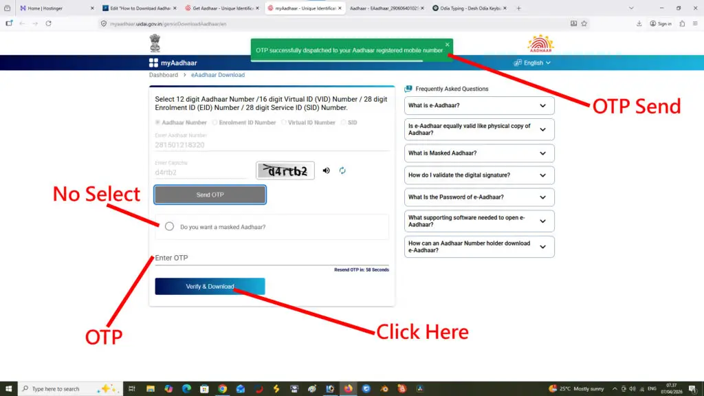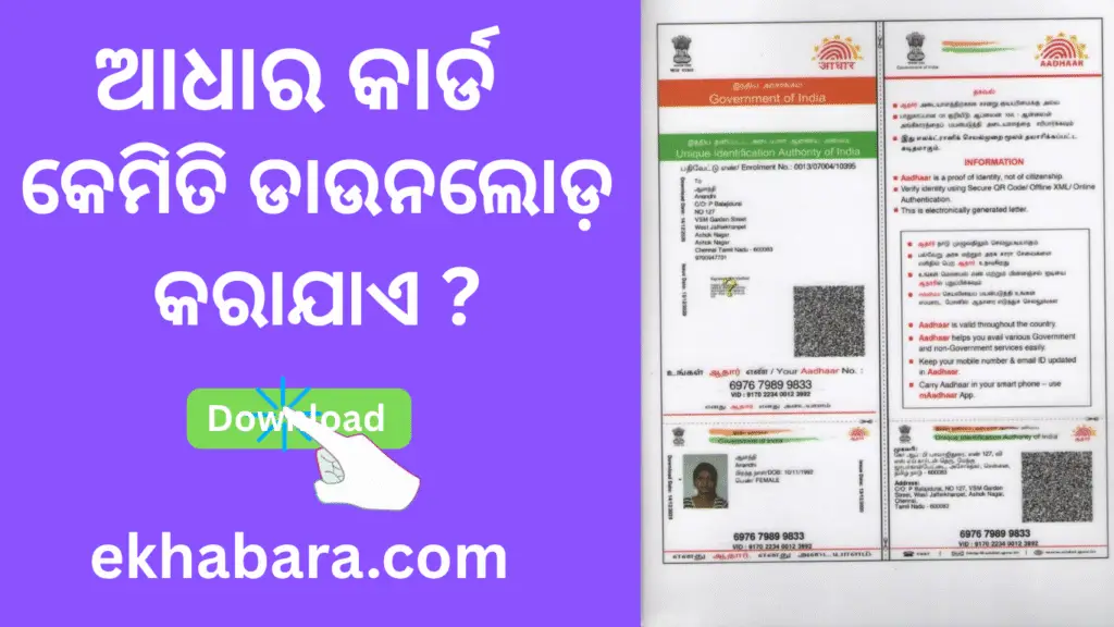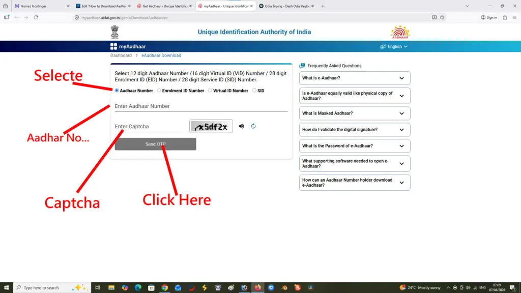 ପ୍ରଥମେ 4 ଟି ଅପସନ ରହିଛି ସେଥି ମଧ୍ୟରୁ Aadhaar Number ଅପସନ କୁ ସିଲେକ୍ଟ କରିବେ ,Enter Aadhaar Number ସ୍ଥାନରେ 12 ଅଙ୍କ ବିଶିଷ୍ଟ ଆଧାର ନମ୍ବର ଟି ଦେବେ, Enter Captcha ସ୍ଥାନରେ ସେହି ସ୍ଥାନର ସାମ୍ନାରେ ଥିବା କ୍ୟାପଚା ଟିକୁ ଭରନ୍ତୁ I ଏହାପରେ Send OTP ( ବଟନ ) ଉପରେ କ୍ଲିକ କରନ୍ତୁ, ମୋବାଇଲ ନୁମ୍ବର କୁ OTP ଆସିଥିବ ଚେକ କରିନିଅନ୍ତୁ I ଏହାପରେ ତଳେ ଦିଆ ଯାଇଥିବା ପେଜ ଟି ଖୋଲି ଯିବ I